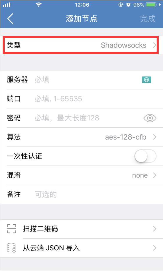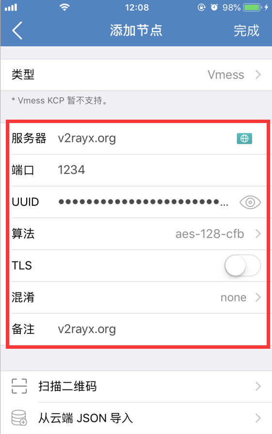 根据提供商提供的节点信息,填入服务器/端口/UUID,其他没有点不用改,备註可自命名,然后点"完成"